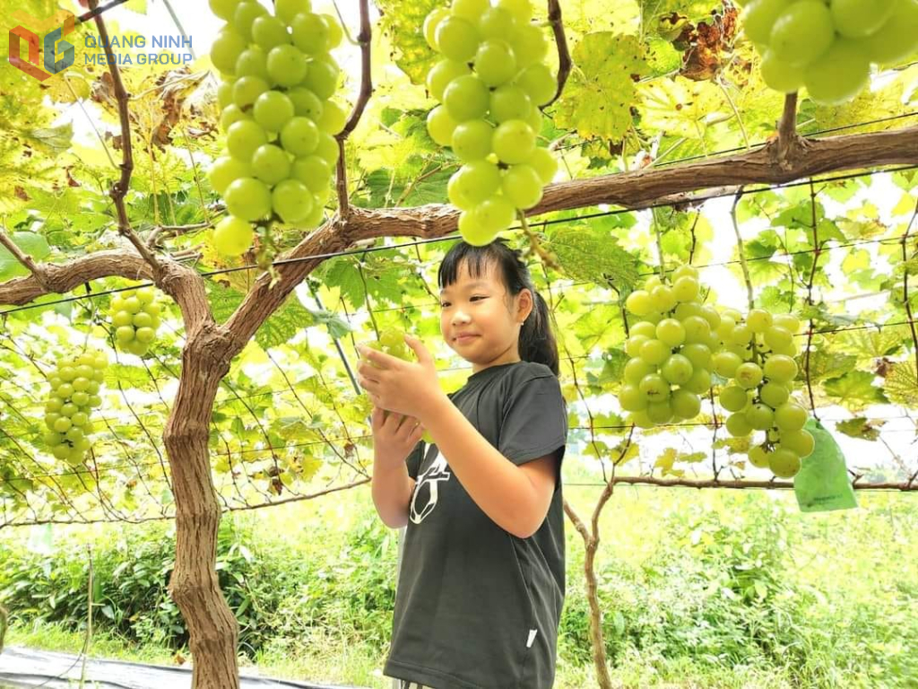 Du khách nhí trải nghiệm hái nho sữa tại vườn nho của gia đình chị Trần Thị Vân, thôn Pặc Pùng, xã Bình Liêu. Ảnh: Trần Vân.