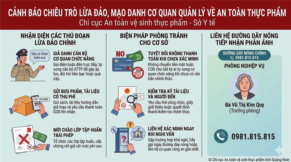 Đây là hành vi lừa đảo, vi phạm pháp luật, gây ảnh hưởng nghiêm trọng đến hoạt động sản xuất, kinh doanh và uy tín của cơ quan quản lý nhà nước. Để chủ động phòng tránh, Chi cục An toàn vệ sinh thực phẩm tỉnh khuyến cáo các cơ sở thực phẩm và người dân: